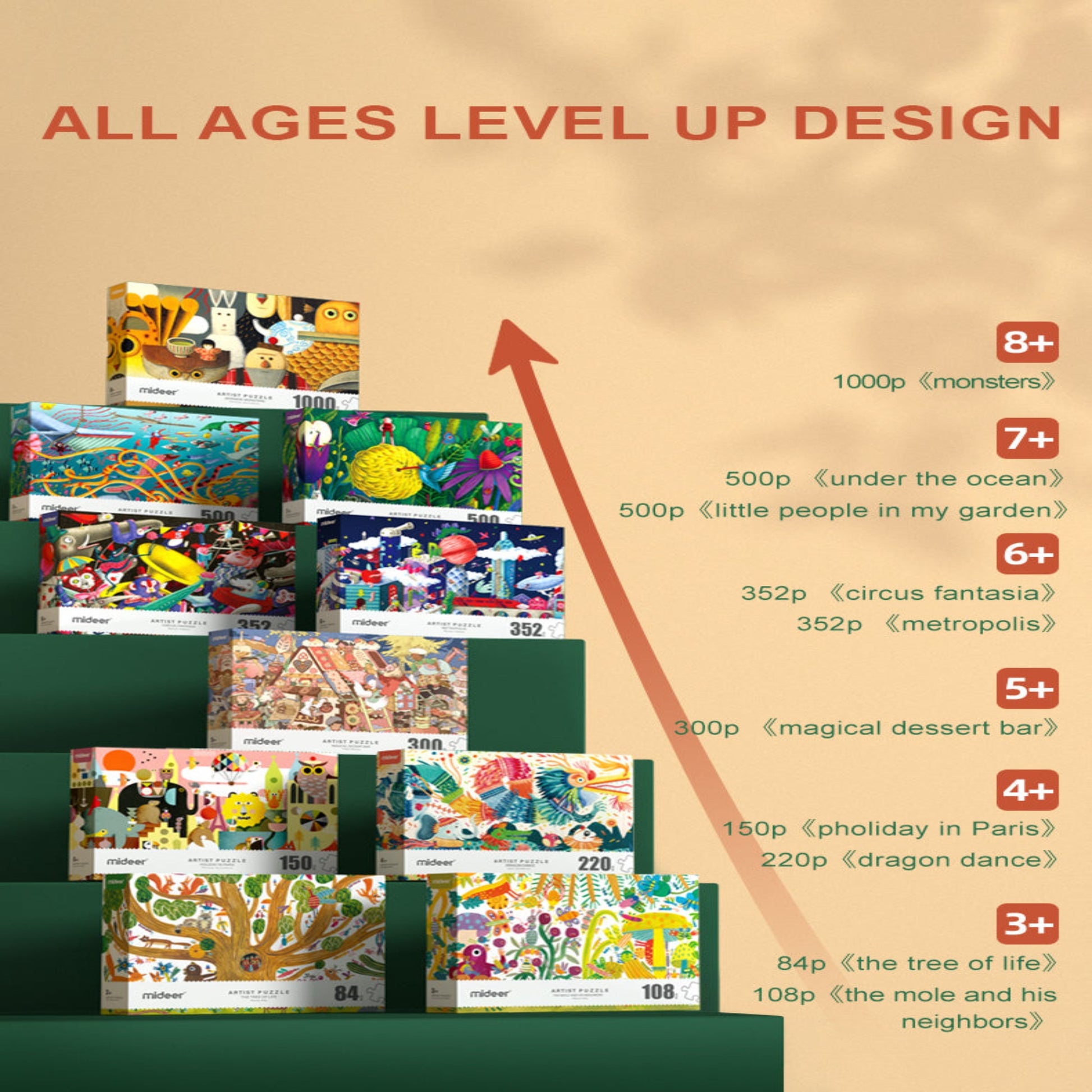 Our Level-up Jigsaw Puzzle Kits are illustration puzzles suitable for ages ranging from 3 to 8 years. Designed by world-class artists, the puzzles showcase diverse expressions and aesthetics.
